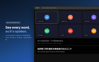 TransLive هو ملحق مجاني لمتصفح Chrome مصمم للتفريغ والترجمة في الوقت الحقيقي أثناء الاجتماعات عبر الإنترنت. يتكامل بسلاسة مع المنصات الشهيرة مثل Google Meet و Microsoft Teams و Zoom، مما يسمح للمستخدمين بالتقاط الصوت وعرض الترجمة الحية أثناء تطور المحادثات. يدعم هذا الأداة أكثر من سبع لغات، بما في ذلك الصينية والإنجليزية واليابانية، مما يجعلها حلاً مثالياً للفرق متعددة اللغات. يمكن للمستخدمين بدء الخدمة بسهولة بنقرة واحدة فقط، مما يضمن إعدادًا سريعًا وفعالًا.